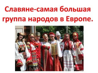 Славяне представляют собой крупнейшую этническую группу в Европе, включающую народы, такие как русские, украинцы, поляки и другие. Первые упоминания о славянах датируются концом II тысячелетия до нашей эры, когда их называли венедами. Славяне делятся на три основные группы и первыми образовали государство Киевская Русь, где занимались различными видами деятельности, включая земледелие и ремесла.