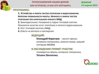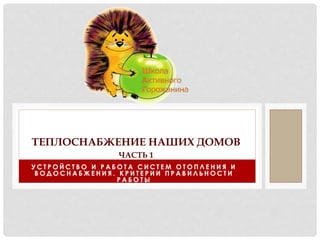 Документ содержит подробное описание устройства и работы систем отопления и водоснабжения, а также законодательные требования к подаче тепловой энергии в многоквартирных домах. Рассматриваются критерии качества услуг отопления и горячего водоснабжения, а также важные аспекты учета тепловой энергии. В документе также обсуждаются проблемы перетопа и недотопа, а также способы оценки качества предоставляемых коммунальных услуг.