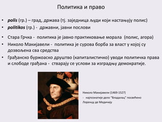 • Николо Макијавели - политика је сурова борба за власт у којој су
