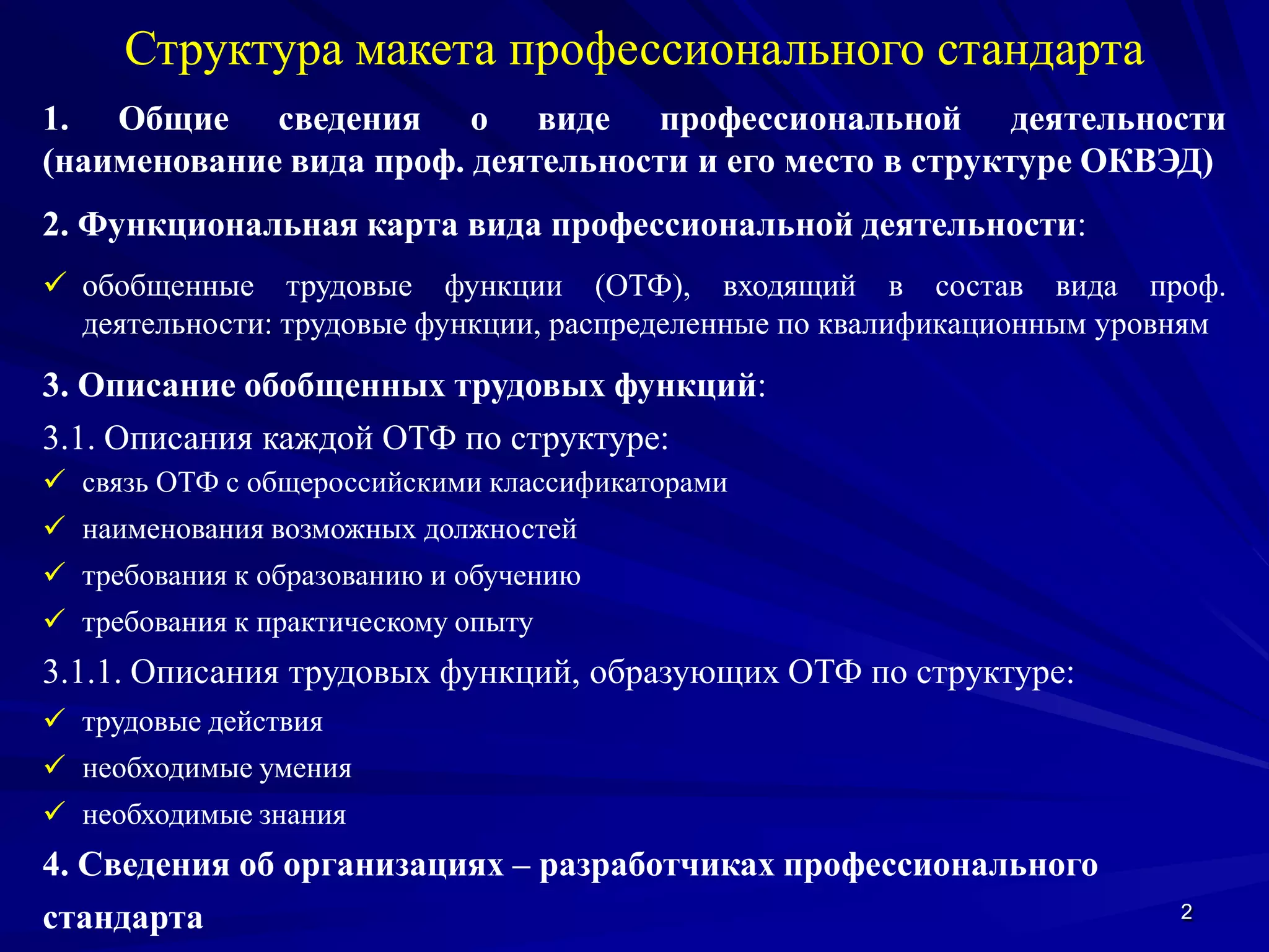 Документ описывает профессиональные стандарты в области информационной безопасности, включая структуру и функции данных стандартов. Он содержит перечень профессий, методов разработки стандартов и нормативно-правовую базу, необходимую для их создания. Также представлены квалификационные уровни и требования к различным специалистам в этой области.