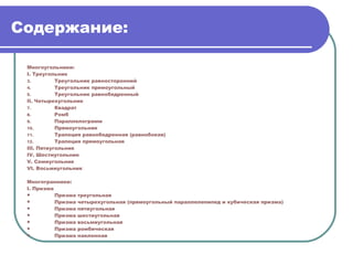 Документ представляет собой каталог геометрических фигур и тел, включая многоугольники, многогранники, призмы и пирамиды, а также различные типы многогранников, такие как правильные и архимедовы тела. Он содержит систематизированное описание каждой группы фигур, их типов и подкатегорий. Описание является полезным ресурсом для обучения геометрии и развития логических способностей.