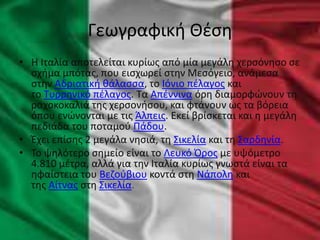 • ΗΙταλία αποτελείται κυρίως από μία μεγάλη χερσόνησο σε