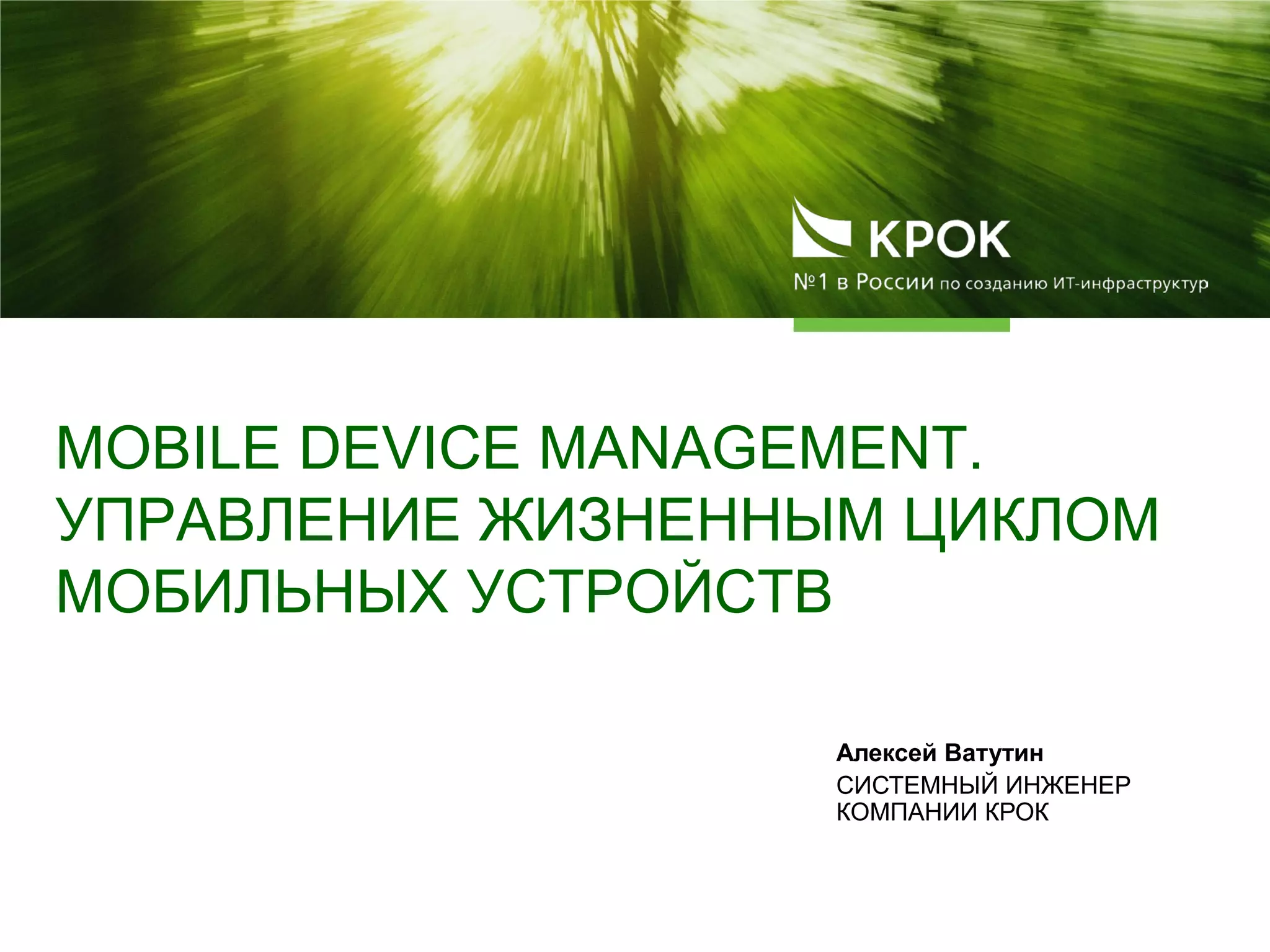 Документ описывает концепцию управления мобильными устройствами (MDM) и его важность для обеспечения безопасности и удобства использования в организациях. Подробно рассматриваются основные проблемы MDM, жизненный цикл мобильных устройств и функции систем MDM, такие как централизованное управление настройками, инвентаризация и удаленная очистка данных. Также упоминаются распространенные решения MDM на российском рынке и требования к внедрению для разных платформ.