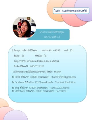 เลขที่ 13 1. ชื่อ-สกุล : ธนิตา กิตติวิทิตคุณ เลขประจาตัว 44033 เลขที่ 13 ชื่อเล่น : วิว กรุ๊ปเลือด : โอ ที่อยู่ : 193/75 ถ.ช้างเผือก ต.ช้างเผือก อ.เมือง จ. เชียงใหม่ โทรศัพท์ที่ติดต่อได้ : 090-672 9197 ภูมิลาเนาเดิม (กรณีไม่ได้อยู่กับบิดามารดา) จังหวัด : กรุงเทพฯ ชื่อ Gmail ที่ใช้ในวิชา ง 33201 (คอมพิวเตอร์) : thanita12341@gmail.com ชื่อ facebook ที่ใช้ในวิชา ง 33201 (คอมพิวเตอร์) : Thanita Kittiwithitkun ชื่อ Blog ที่ใช้ในวิชา ง 33201 (คอมพิวเตอร์) : com610_13_thanita ชื่อ Slideshare ที่ใช้ในวิชา ง 33201 (คอมพิวเตอร์) : section93_ ใบงาน แบบสารวจตนเองและประวัติ