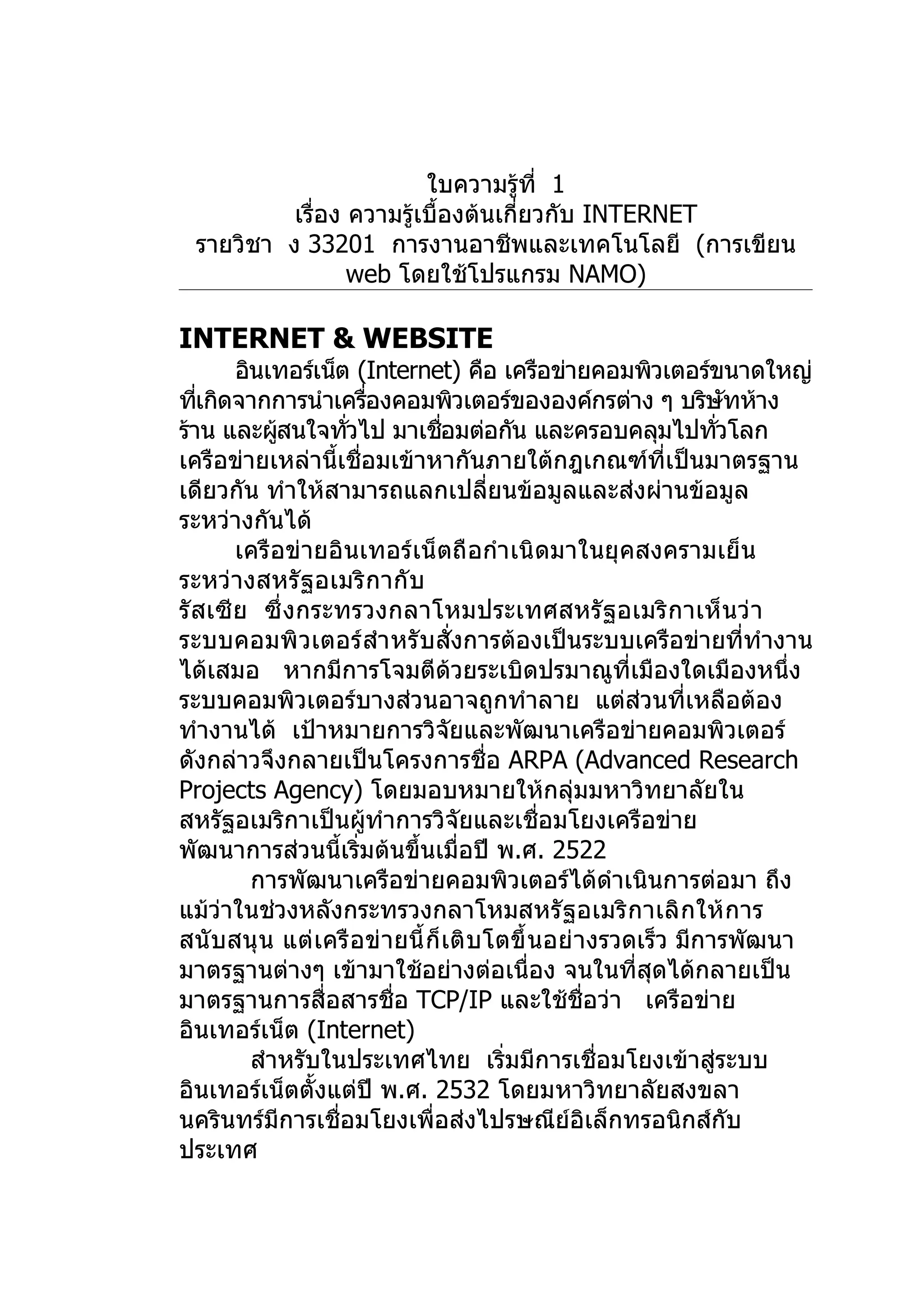 เรื่อง ความรู้เบื้องต้นเกี่ยวกับ INTERNET รายวิชา ง 33201 การงานอาชีพและเทคโนโลยี (การเขียน web โดยใช้โปรแกรม NAMO) INTERNET & WEBSITE อินเทอร์เน็ต (Internet) คือ เครือข่ายคอมพิวเตอร์ขนาดใหญ่ ทีเกิดจากการนำาเครืองคอมพิวเตอร์ขององค์กรต่าง ๆ บริษทห้าง ่ ่ ั ร้าน และผูสนใจทัวไป มาเชือมต่อกัน และครอบคลุมไปทัวโลก ้ ่ ่ ่ เครือข่ายเหล่านี้เชื่อมเข้าหากันภายใต้กฎเกณฑ์ที่เป็นมาตรฐาน เดียวกัน ทำาให้สามารถแลกเปลียนข้อมูลและส่งผ่านข้อมูล ่ ระหว่างกันได้ เครือข่ายอินเทอร์เน็ตถือกำาเนิดมาในยุคสงครามเย็น ระหว่างสหรั ฐอเมริ กากั บ รั สเซี ย ซึ่ งกระทรวงกลาโหมประเทศสหรั ฐอเมริ กาเห็ นว่ า ระบบคอมพิ วเตอร์ สำา หรั บสั่งการต้องเป็นระบบเครือข่ายที่ทำางาน ได้เสมอ หากมีการโจมตีด้วยระเบิดปรมาณูที่เมืองใดเมืองหนึ่ง ระบบคอมพิวเตอร์บางส่วนอาจถูกทำาลาย แต่ส่วนที่เหลือต้อง ทำางานได้ เป้าหมายการวิจยและพัฒนาเครือข่ายคอมพิวเตอร์ ั ดังกล่าวจึงกลายเป็นโครงการชื่อ ARPA (Advanced Research Projects Agency) โดยมอบหมายให้กลุ่มมหาวิทยาลัยใน สหรัฐอเมริกาเป็นผูทำาการวิจัยและเชื่อมโยงเครือข่าย ้ พัฒนาการส่วนนี้เริมต้นขึ้นเมื่อปี พ.ศ. 2522 ่ การพัฒนาเครือข่ายคอมพิวเตอร์ได้ดำาเนินการต่อมา ถึง แม้ว่าในช่วงหลังกระทรวงกลาโหมสหรั ฐอเมริ กาเลิ กให้ การ สนั บสนุ น แต่ เครื อข่ ายนี้ ก็ เติ บโตขึ้ นอย่ างรวดเร็ว มีการพัฒนา มาตรฐานต่างๆ เข้ามาใช้อย่างต่อเนื่อง จนในที่สุดได้กลายเป็น มาตรฐานการสื่อสารชื่อ TCP/IP และใช้ชื่อว่า เครือข่าย อินเทอร์เน็ต (Internet) สำาหรับในประเทศไทย เริ่มมีการเชื่อมโยงเข้าสู่ระบบ อินเทอร์เน็ตตั้งแต่ปี พ.ศ. 2532 โดยมหาวิทยาลัยสงขลา นครินทร์มีการเชื่อมโยงเพื่อส่งไปรษณีย์อิเล็กทรอนิกส์กับ ประเทศ