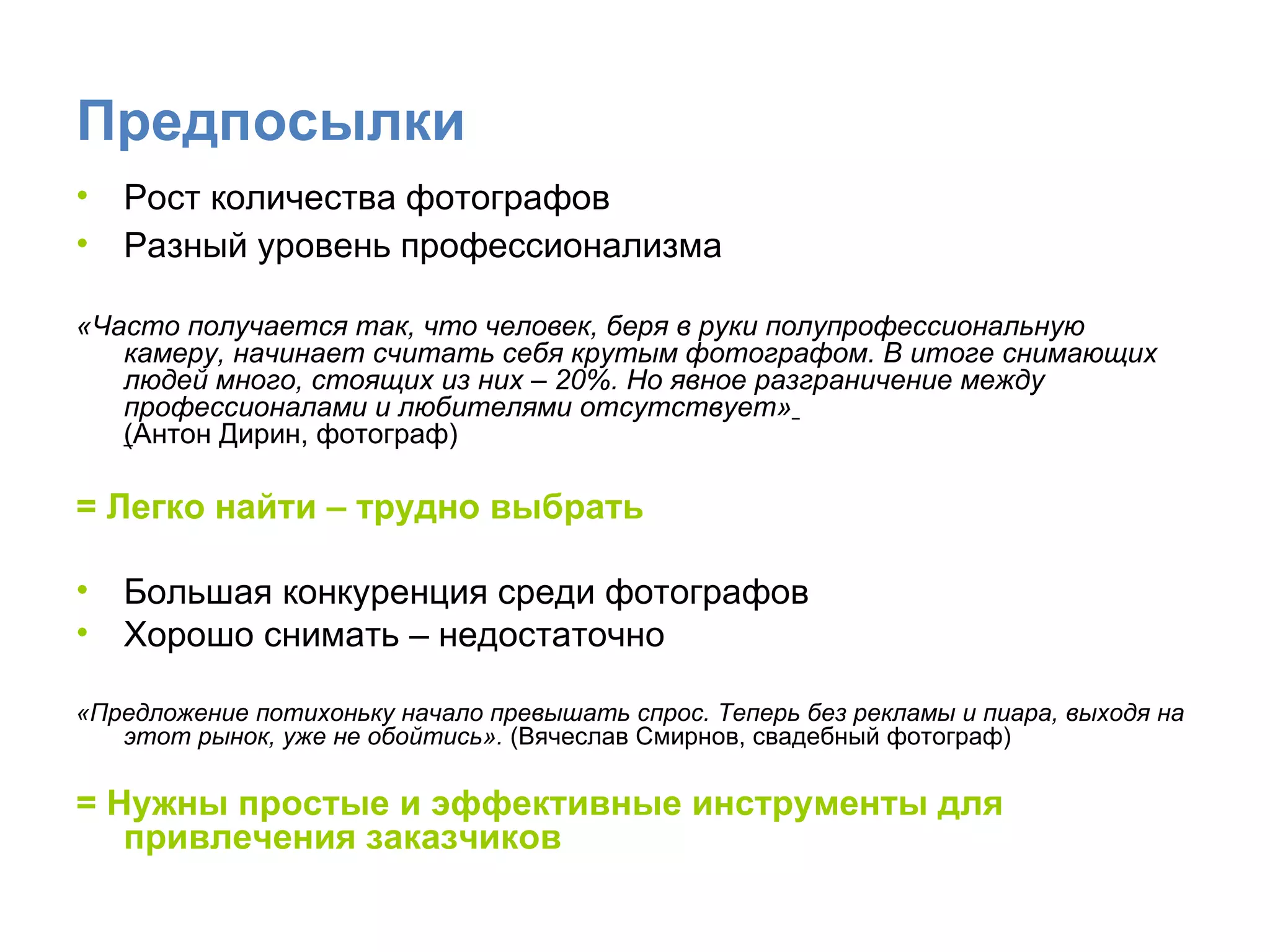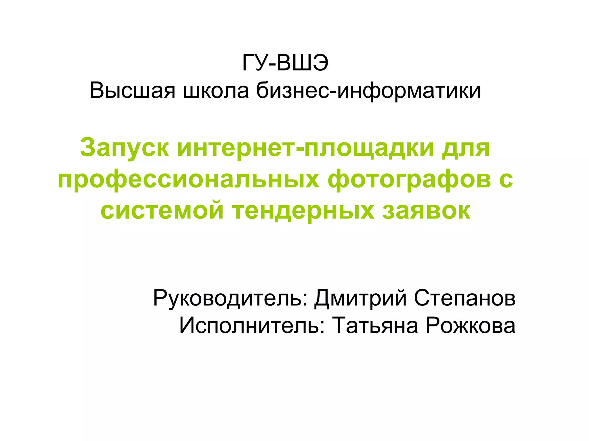 Документ описывает запуск интернет-площадки для профессиональных фотографов с системой тендерных заявок, разработанную для решения проблемы нахождения заказчиков в условиях высокой конкуренции. Основные цели включают оценку спроса на услуги фотографов, конкурентный анализ и описание бизнес-модели проекта. Также освещены необходимые маркетинговые стратегии и модели монетизации для привлечения пользователей и увеличения доходов.