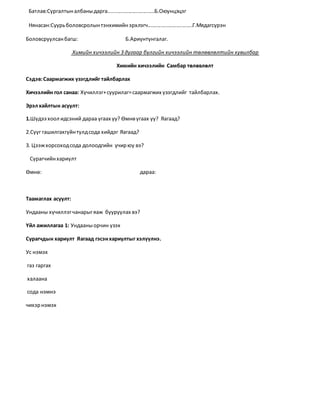 Батлав:Сургалтыналбаныдарга................................Б.Оюунцэцэг Нянасан:Суурьболовсролынтэнхимийнэрхлэгч...............................Г.Мядагсүрэн Боловсруулсанбагш: Б.Ариунтунгалаг. Химийн хичээлийн