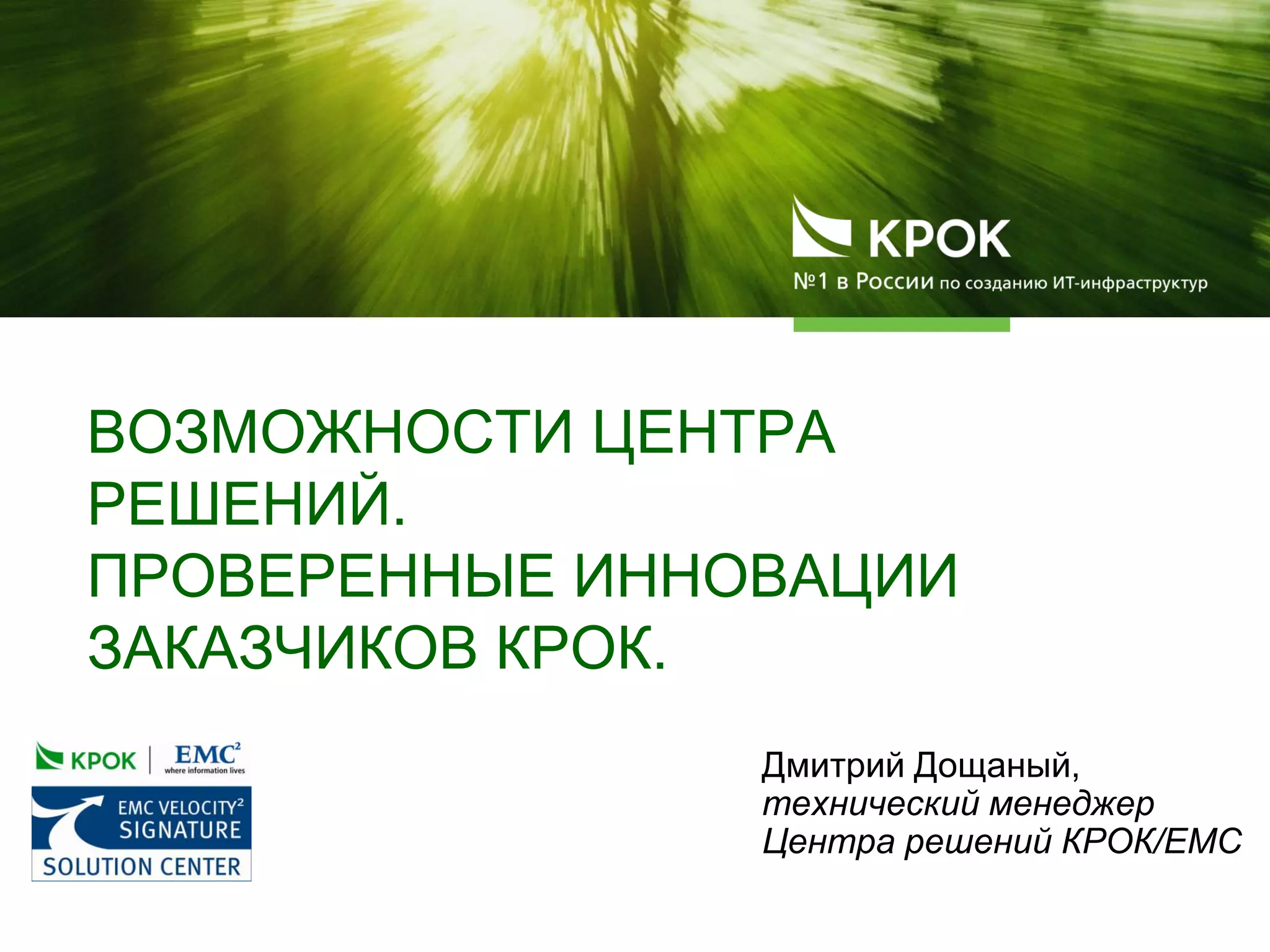 Документ описывает Центр решений компании Крок в сотрудничестве с EMC, который предлагает консультации, демонстрации и интеграцию высокотехнологичного аппаратного и программного обеспечения. Крок является первым центром решений EMC в России и СНГ, с акцентом на инновации в области хранения данных, виртуализации и оптимизации приложений. В документе также представлены планы на будущее и текущее сотрудничество с различными партнерами и технологиями.
