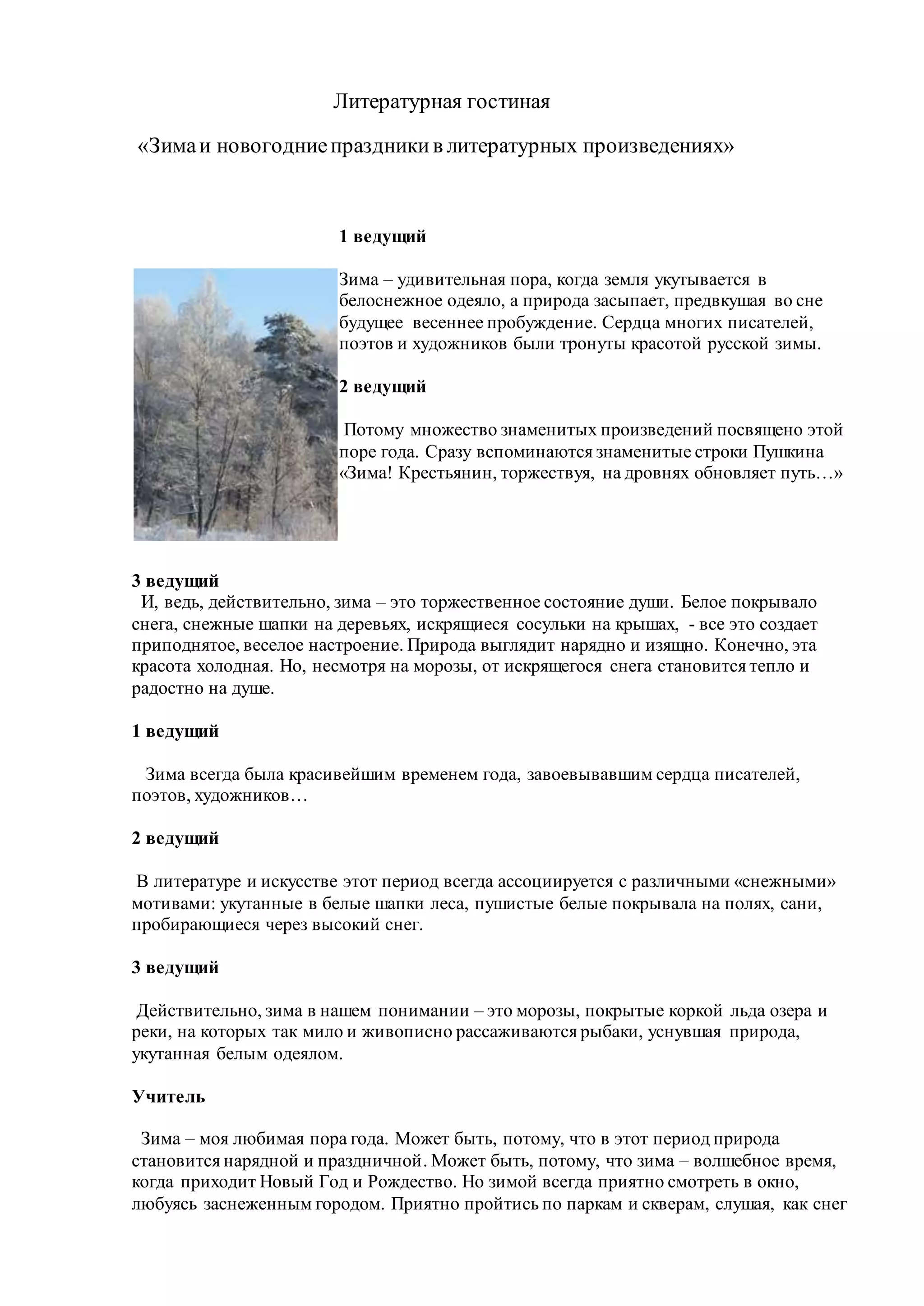 Документ представляет собой программу литературной гостиной, посвященной зиме и новогодним праздникам в литературных произведениях. Участники читают стихи и отрывки, описывающие красоту зимы, зимние пейзажи и новогодние традиции, передавая атмосферу праздника и чувств, связанных с этим временем года. В завершение программы подчеркивается ценность русской классической литературы для обогащения внутреннего мира людей.