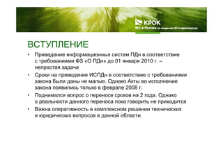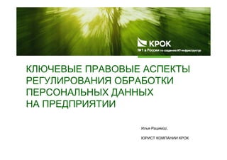 Документ рассматривает ключевые правовые аспекты регулирования обработки персональных данных (ПДн) на предприятии, включая обязанности операторов ПДн, необходимость согласия субъектов и лицензирования деятельности по технической защите информации. Обсуждаются сроки приведения информационных систем в соответствие с законодательством, а также риски и ответственность за неправомерное обращение с ПДн. Компания 'Крок' предлагает услуги по аудитам и внедрению систем защиты ПДн в соответствии с требованиями закона.
