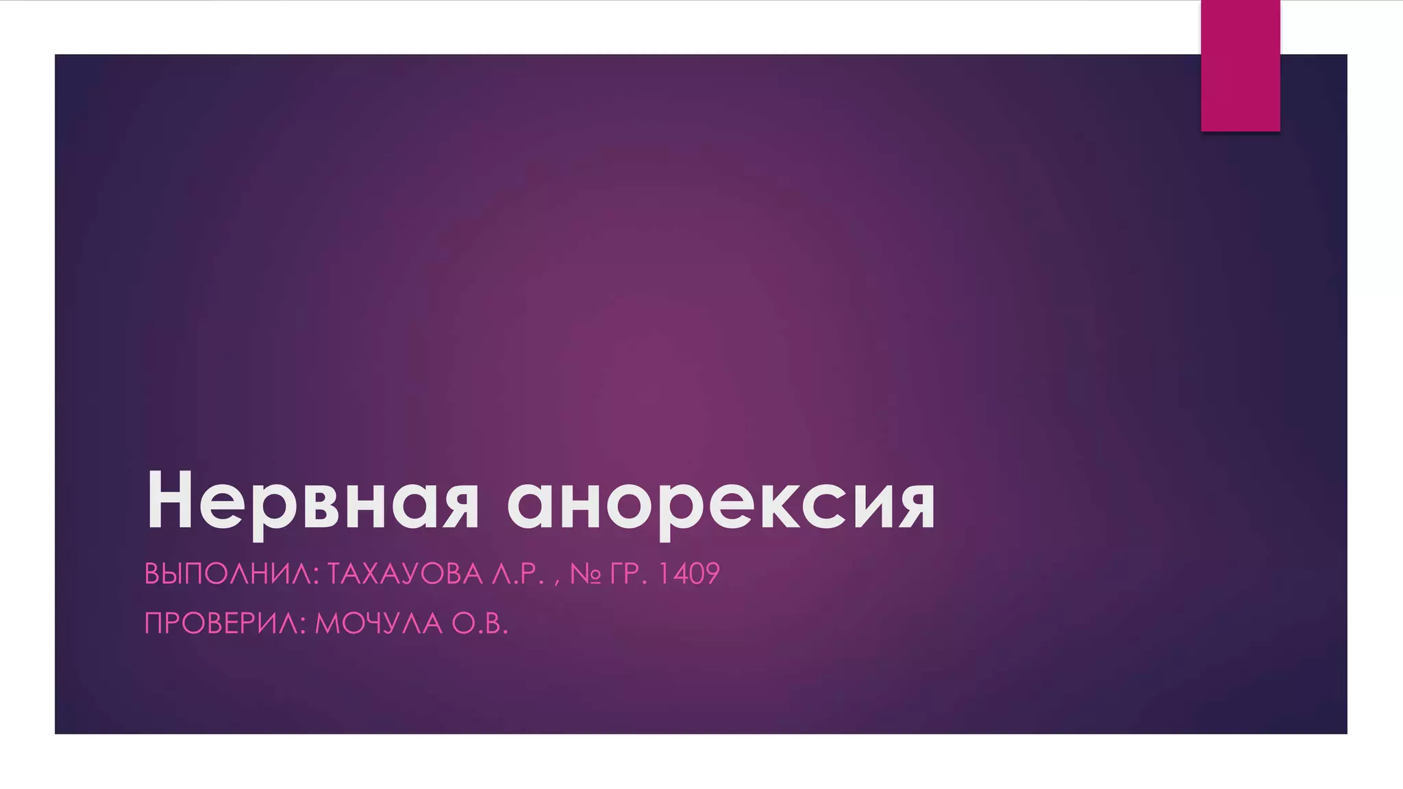 Документ описывает нервную анорексию как пищевое расстройство, связанное с преднамеренным снижением веса и страхом ожирения. Обсуждаются причины анорексии, включая биологические, психологические и социальные факторы, а также клинические проявления и стадии заболевания. Ведется акцент на том, что анорексия чаще всего проявляется у женщин в подростковом возрасте и имеет серьезные последствия для здоровья.