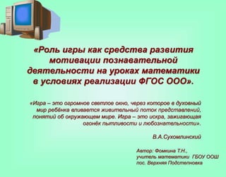 Документ обсуждает использование дидактических игр на уроках математики как средства для повышения мотивации учащихся и развития их познавательной деятельности в контексте реализации ФГОС. Игра рассматривается как эффективный инструмент, который способствует активному вовлечению учащихся, улучшению усвоения материала и формированию интереса к учебе. Также представлены принципы организации игр и примеры заданий, подчеркивающие важность творческого подхода в обучении.