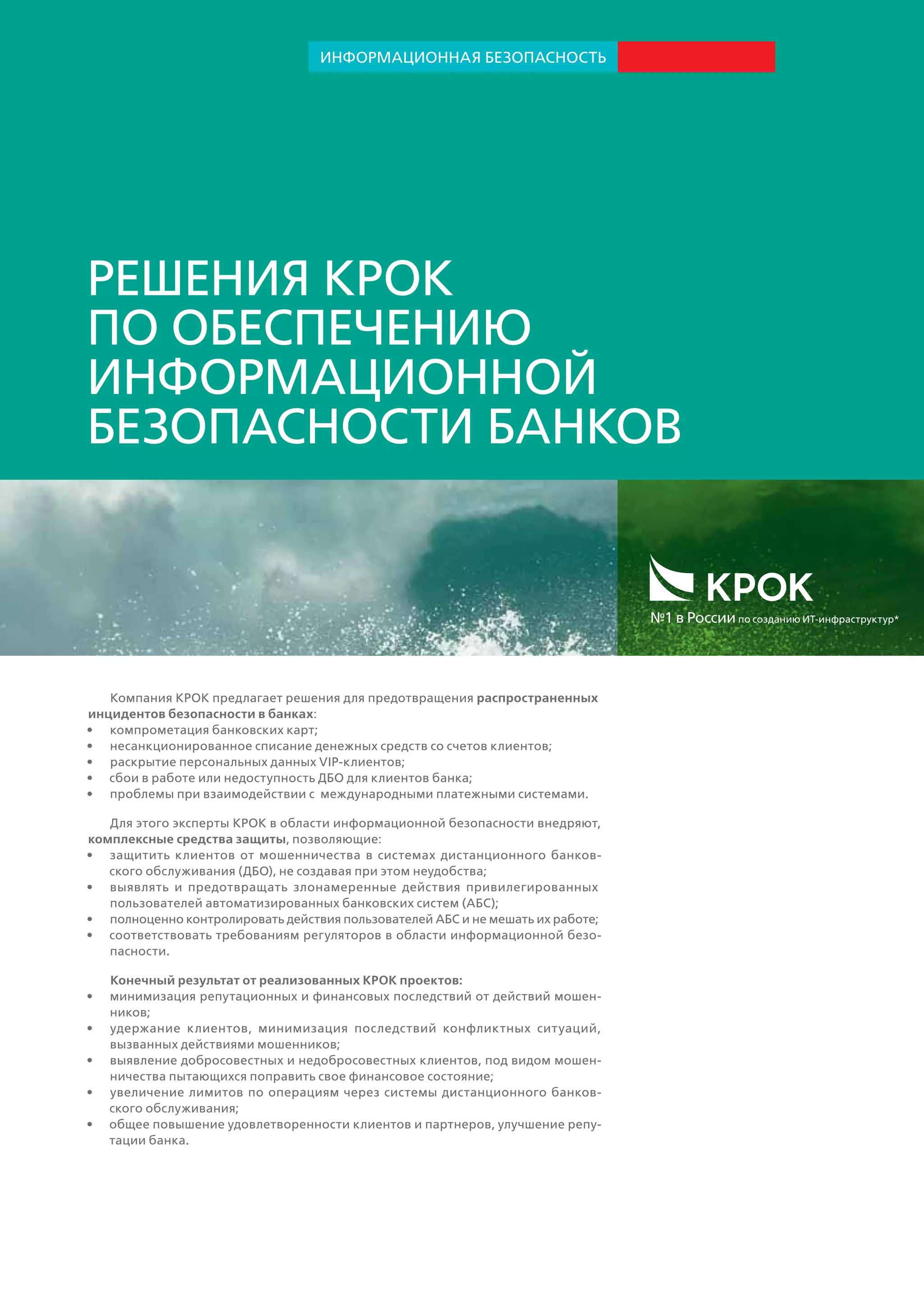 Документ описывает решения компании Крок в области информационной безопасности для банков, включая защиты от мошенничества, соблюдение регуляторных стандартов и обеспечение безопасности систем дистанционного банковского обслуживания. Упоминаются механизмы для выявления и предотвращения несанкционированных действий, а также консультирование по соответствию требованиям федеральных законов. Крок акцентирует внимание на балансе удобства и безопасности для клиентов, а также на снижении репутационных и финансовых рисков.