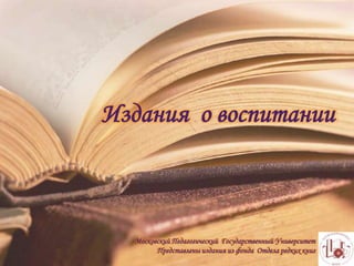Выставка изданий о воспитании в Московском педагогическом государственном университете демонстрирует редкие книги и журналы, отражающие развитие педагогической мысли в России и за рубежом, особенно в конце XIX - начале XX века. Документ также включает аннотации и ссылки на веб-ресурсы, описывающие концепции воспитания, что может быть полезно как для студентов истории педагогики, так и для широкой аудитории. В выставке представлены работы известных педагогов, таких как К. Д. Ушинский и Жан Жак Руссо.