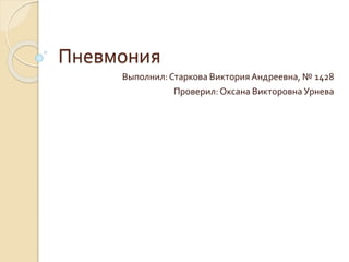 Документ описывает пневмонию, определяя её как воспаление лёгочной ткани инфекционного характера, преимущественно бактериального происхождения. Основные возбудители включают пневмококк и стафилококк, а также атипичные инфекции. Клиническая картина пневмонии включает симптомы интоксикации, воспалительных изменений в лёгчих и возможное вовлечение других органов.