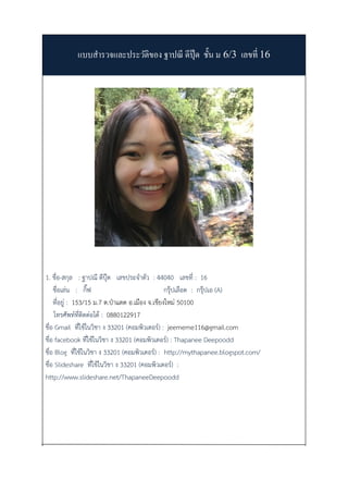 ชั้น ม 6/3 เลขที่ 16 1. ชื่อ-สกุล : ฐาปณี ดีปุ๊ด เลขประจาตัว : 44040 เลขที่ : 16 ชื่อเล่น : กิ๊ฟ กรุ๊ปเลือด : กรุ๊ปเอ (A) ที่อยู่ : 153/15 ม.7 ต.ป่าแดด อ.เมือง จ.เชียงใหม่ 50100 โทรศัพท์ที่ติดต่อได้ : 0880122917 ชื่อ Gmail ที่ใช้ในวิชา ง 33201 (คอมพิวเตอร์) : jeememe116@gmail.com ชื่อ facebook ที่ใช้ในวิชา ง 33201 (คอมพิวเตอร์) : Thapanee Deepoodd ชื่อ Blog ที่ใช้ในวิชา ง 33201 (คอมพิวเตอร์) : http://mythapanee.blogspot.com/ ชื่อ Slideshare ที่ใช้ในวิชา ง 33201 (คอมพิวเตอร์) : http://www.slideshare.net/ThapaneeDeepoodd