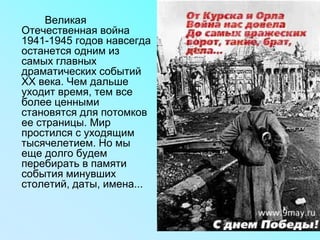 Документ посвящен Великой Отечественной войне 1941-1945 годов и ее значению в истории России, подчеркивая важность памяти о жертвах и героизме солдат. Также он рассматривает роль музыки и песен, созданных в это время, как средство поддержки и сплочения народа. Важные песни и их истории отражают чувства и переживания людей, связанных с войной.