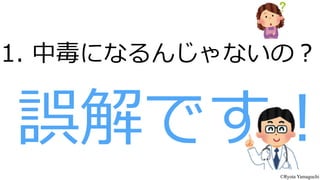 事実無根です。医療療⽤用⿇麻薬の⼀一番の利利点は有効限界がないことで す(効かなくなったりしない)。症状が強くなって徐々に量量を増 やす必要となることがありますが、あくまで痛みの⽅方が強くなっ ているためで、薬が効かなくなっているからではないとご理理解く ださい。 2. そのうち効かなくなる? ©Ryota Yamaguchi