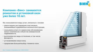 Компания «Винс» предлагает услуги по установке, ремонту и обслуживанию окон более 18 лет, включая пластиковые, деревянные и алюминиевые конструкции. Мы работаем с корпоративными клиентами и предоставляем широкий спектр услуг, включая остекление, тюнинг и сервисное обслуживание окон. Наша команда имеет опыт, гибкие условия оплаты и предлагает скидки для постоянных клиентов.