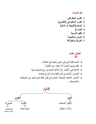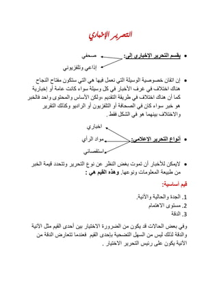 تناقش الوثيقة أهمية وخصائص التحرير الإخباري، وتحدد أنواع المحتوى والقيم الأساسية المرتبطة بالأخبار مثل الآنية والدقة. تقدم الوثيقة نصائح للصحفيين حول موضوعية الأخبار وكيفية التعامل مع الذاتية، بالإضافة إلى توضيح الفرق بين الخبر والتقرير. كما تسلط الضوء على المدارس التقليدية والحديثة في التحرير واللغة المستخدمة في الصحافة.