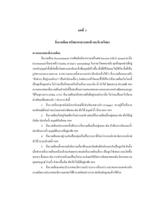 สิ่ งแวดล้ อม ทรัพยากรธรรมชาติ และนิเวศวิทยา ความหมายของสิ่ งแวดล้ อม สิ่ งแวดล้อม (Environment) รากศัพท์เคมีจากภาษาฝรั่งเศส Environ แปลว่า around ฉะนั้น Environment จึงหมายถึง Totality of man’s surroundings ในภาษาไทยหมายถึง ทุกสิ่ งทุกอย่างที่อยู่ รอบตัวมนุษย์ ทั้งที่เกิดขึ้นโดยธรรมชาติและสิ่ งที่มนุษย์สร้างขึ้น ทั้งที่มีชีวิตและไม่มีชีวิต ทั้งที่เป็ น รู ปธรรมและนามธรรม จากความหมายนี้ สามารถกล่ า วอี กนัยหนึ่ งได้ว่า สิ่ งแวดล้อมหมายถึ ง ่ “สิ่ งต่างๆ ที่อยูรอบตัวเรา” เป็ นคํานิยามสั้นๆ ง่ายต่อการเข้าใจและชี้ให้เป็ นว่าสิ่ งแวดล้อมในโลกนี้ เป็ นทุกสิ่ งทุกอย่าง ไม่ว่าจะเป็ นสิ่ งของหรื อบ้านเรื อน ถนน ดิน นํ้า ป่ าไม้ วัฒนธรรม ประเพณี ฯลฯ ความหมายของสิ่ งแวดล้อมคําหลังนี้ จึงสะท้อนความหมายของความหมายแรกอย่างชัดเจนและถูก ใช้ในทุกวงการ (เกษม, 2536) สิ่ งแวดล้อมหรื อสรรพสิ่ งที่อยูรอบตัวเรานั้น ไม่ว่าจะเป็ นอะไรก็ตาม ่ ต่างมีสมบัติเฉพาะตัว 7 ประการ ดังนี้ 1. สิ่ ง แวดล้อ มทุ ก ชนิ ด มี เ อกลัก ษณ์ ที่ เ ด่ น ชัด เฉพาะตัว (Unique) จะอยู่ ที่ ใ ดก็ ต าม เอกลักษณ์ดงกล่าวจะบ่งบอกอย่างชัดเจน เช่น ต้นไม้ มนุษย์ นํ้า บ้าน ถนน ฯลฯ ั 2. สิ่ งแวดล้อมไม่อยูโดดเดี่ยวในธรรมชาติ แต่จะมีสิ่งแวดล้อมอื่นอยูเ่ สมอ เช่น ต้นไม้อยู่ ่ ั กับดิน ปลากับนํ้า มนุษย์กบสังคม ฯลฯ 3. สิ่ งแวดล้อมประเภทหนึ่ งต้องการสิ่ งแวดล้อมอื่นอยู่เสมอ เช่น ป่ าต้องการดินและนํ้า ่ ปลาต้องการนํ้า มนุษย์ตองการที่อยูอาศัย ฯลฯ ้ 4. สิ่ งแวดล้อมจะอยูรวมกันเป็ นกลุ่มหรื อเป็ นระบบ ที่เรี ยกว่าระบบนิเวศ เช่นระบบนิเวศ ่ ป่ าไม้ ระบบนิเวศนํ้า ฯลฯ 5. สิ่ งแวดล้อมทั้งหลายมักมีความเกี่ยวข้องและสัมพันธ์ต่อกันและกันเป็ นลูกโซ่ ดังนั้น เมื่อทําลายสิ่ งแวดล้อมหนึ่ งแล้วจะส่ งผลกระทบต่อสิ่ งแวดล้อมอื่นๆ เป็ นลูกโซ่ เสมอ และเกิดขึ้น หลายๆ ขั้นตอน เช่น การทําลายป่ าจนเสื่ อมโทรม จะส่ งผลให้เกิดการพังทลายของดิน ดินขาดความ ่ อุดมสมบูรณ์ อ่างนํ้า ลําธารตื้นเขิน สัตว์ป่าไม่มีที่อยูอาศัย ฯลฯ 6. สิ่ งแวดล้อมแต่ ละประเภทจะมี ความเปราะบาง แข็งแกร่ ง และทนทานแตกต่ างกัน บางชนิดบางประเภทจะมีความคงทนได้ดี บางชนิดเปราะง่าย เช่นดินมักถูกซะล้างได้ง่าย