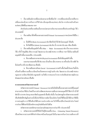 7. สิ่ งแวดล้อมมีการเปลี่ยนแปลงตามเวลาที่เปลี่ยนไป การเปลี่ยนแปลงนั้นอาจเป็ นการ เปลี่ ยนแปลงชั่ว คราวหรื อ ถาวรก็ไ ด้ เช่ น เมื องทุ กเมื อ งจะค่ อยๆ เติ บโต การทํา ลายป่ าแล้ว เผา จะค่อยๆ มีพืชขึ้นมาทดแทน ฯลฯ สําหรับประเภทสิ่ งแวดล้อมนั้นหากแบ่งตามการเกิด สามารถออกเป็ นประเภทใหญ่ๆ ได้ 2 ประเภทดังนี้ 1. สิ่ งแวดล้อม ที่เกิดขึ้นเองตามธรรมชาติ (Natural Environment) อาจแบ่งออกได้เป็ น 2 ประเภท คือ ก. สิ่ งมีชีวิต (Biotic Environment) เช่น พืชหรื อป่ าไม้ สัตว์และมนุษย์ เป็ นต้น ข. สิ่ งไม่มีชีวิต (Abiotic Environment) เช่น ดิน นํ้า อากาศ ควัน เมฆ เสี ยง เป็ นต้น 2. สิ่ งแวดล้อมที่มนุษย์สร้างขึ้น (Man – Made Environment) เช่น บ้าน ถนน สะพาน โต๊ะ เก้าอี้ วัตถุมีพิษ เสี ยง อารมณ์ วัฒนธรรม ประเพณี ศาสนา การศึกษา ฯลฯ ซึ่ งสิ่ งแวดล้อมที่ มนุษย์สร้างขึ้นอาจแยกเป็ น 2 ประเภทคือ ก. สิ่ งแวดล้อมทางกายภาพ (Physical Environment) เป็ นสิ่ งที่มนุษย์สร้างขึ้น และสามารถมองเห็นได้ เช่น ถนน บ้านเรื อน เมือง สะพาน รถ เครื่ องบิน เรื อ เจดีย ์ วัด สิ่ งก่อสร้าง หรื อ สถาปั ตยกรรม เป็ นต้น ข. สิ่ งแวดล้อมทางสังคม (Social Environment) อาจสร้างขึ้นโดยตั้งใจและไม่ต้ งใจ ั หรื อสร้ า งเพื่อความเป็ นระเบี ยบเรี ยบร้ อยของการอยู่ร่ว มกัน เช่ น วัฒนธรรม ประเพณี ศาสนา กฎหมาย ระเบียบ ข้อบังคับ กฎเกณฑ์ รวมไปถึง การทะเลาะวิวาท การส่ งเสี ยงด่าทอ พฤติกรรม ลักษณะท่าทางนักเลง เป็ นต้น ความหมายของทรัพยากรธรรมชาติ ทรัพยากรธรรมชาติ (Natural Resources) หมายถึงสิ่ งที่เกิดขึ้นเองตามธรรมชาติซ่ ึ งมนุษย์ สามารถนํามาใช้ประโยชน์ในการดํารงชีพและสนองความต้องการของมนุ ษย์ได้ ได้แก่ นํ้า ป่ าไม้ สัตว์ป่า อากาศ แร่ ธาตุ แสงอาทิตย์ มนุษยชาติ เป็ นต้น ดังนั้น ในแง่เศรษฐกิจ ทรัพยากรธรรมชาติ เป็ นปั จจัยที่สาคัญยิ่งอย่างหนึ่ งซึ่ งก่อให้เกิดการผลิต ซึ่ งจะมีประโยชน์ได้ก็ต่อเมื่อได้นามาใช้เพื่อ ํ ํ การเศรษฐกิ จ การใช้จึ ง ต้อ งใช้ด้ว ยความประหยัด และไม่ ใ ห้ สิ้ น เปลื อ งโดยเปล่ า ประโยชน์ การนํามาใช้ตองคํานึงถึงหลักการอนุรักษ์พร้อมกันไปด้วย ้ ทรัพยากรธรรมชาติสามารถแบ่งตามลักษณะของการนํามาใช้ 3 ประเภท ดังนี้ 1. ทรัพยากรธรรมชาติที่ใช้แล้วไม่รู้จกหมดสิ้ น (Non – Exhausting Natural Resources) ั เป็ นทรั พยากรธรรมชาติ ที่ ก่อ กํา เนิ ด มาพร้ อ มกับ มนุ ษ ย์ มี ป ริ ม าณมากเกิ น กว่ า ความต้อ งการที่