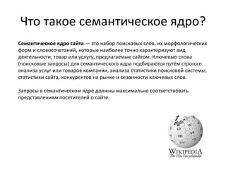 Семантическое ядро сайта представляет собой набор ключевых слов и фраз, которые описывают товары или услуги, предлагаемые компанией. Оно формируется путем анализа рынка, запросов пользователей и статистики конкурентов, что помогает в структуре сайта и SEO-оптимизации. Процесс сбора и группировки запросов включает в себя использование различных инструментов и методов для создания эффективной структуры сайта.