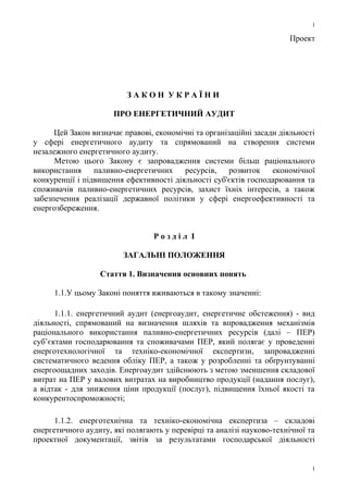 Групою експертів та народних депутатів України підготовлено попередню редакцію проекту Закону України «Про енергетичний аудит», який готується до реєстрації у Верховній Раді України.