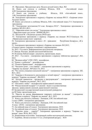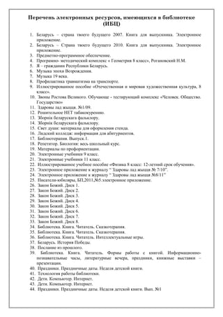 Документ представляет собой перечень электронных ресурсов, предлагаемых библиотекой, включая различные учебники, пособия и видеофильмы по образовательным и здоровьесберегающим программам. Он охватывает материалы по истории, культуре, профилактике травматизма и другим актуальным темам для студентов и школьников. Ресурсы организованы по категориям и включают как приложения к журналам, так и специализированные учебные материалы.