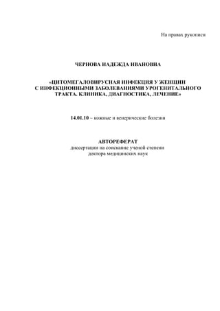 Диссертация Надежды Ивановны Черновой посвящена изучению цитомегаловирусной инфекции у женщин с инфекциями урогенитального тракта, где ставится цель оптимизации методов диагностики и терапии. Исследование выявляет предикторы этого заболевания, его клинико-лабораторные особенности и внесение предложений по комплексной терапии, что связано с повышением эффективности лечения. Работа акцентирует внимание на необходимость комплексного обследования и разработке терапевтической тактики для улучшения результатов лечения.