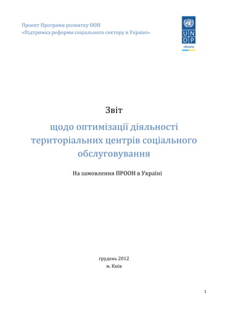 На замовлення Програми розвитку ООН в рамках проекту «Підтримка реформи соціального сектора в Україні» було розроблено звіт щодо оптимізації діяльності територіальних центрів соціального обслуговування (ТЦ) в Україні. У документі перелічені заходи по вдосконаленню ТЦ, серед яких: приведення назви ТЦ у відповідність до законодавчо визначеної термінології; збільшення повноважень ТЦ, виведення послуг на більш сучасний, якісніший рівень; чітке розмежування повноважень персоналу ТЦ та ін. Також у звіті пояснюються юридично-правові основи діяльності ТЦ та способи, у які можна вдосконалити процедури закупівлі товарів та послуг, які використовуються під час діяльності даних установ. Наприкінці основної частини звіту наводяться практики діяльності подібних установ в інших країнах світу, де перелічені послуги, які надають ці установи, порядок їхньої роботи, фінансування тощо.