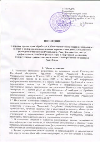 This document outlines policies for processing personal data of patients and employees at a biomedical institution in the Republic of Tula. It establishes procedures for handling personal data in accordance with federal laws on personal data and information security. Personal data will be processed securely and confidentially to protect individuals' rights and privacy, except in cases required by law. All employees must comply with these policies when accessing or handling personal data.