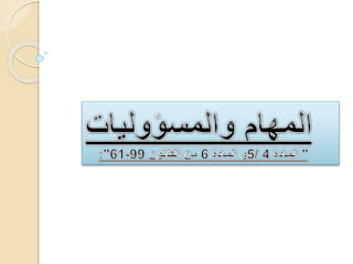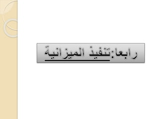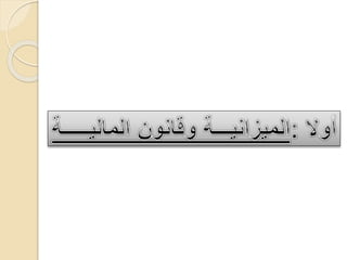 الوثيقة تحتوي على معلومات حول القانون والأنظمة المتعلقة بالميزانية والمسؤوليات المالية للدولة. كما تشير إلى أهمية إعداد الميزانية كوثيقة تقديرية ورخصة لتنفيذ النفقات والإيرادات. علاوة على ذلك، تبرز الوثيقة الأهمية القصوى لإدارة الميزانية بشكل فعال لتحقيق الأهداف الاقتصادية والاجتماعية.