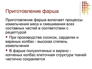 Документ описывает процесс приготовления колбасного фарша, включая этапы измельчения мяса и смешивания ингредиентов согласно рецептуре. Приведены особенности фарша для различных видов колбас, такие как вареные, полукопченые и сырокопченые. Также рассматривается процесс формования колбас, включая подготовку оболочек и правила шприцевания.