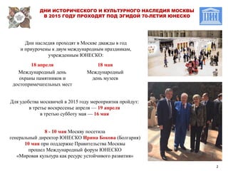 19 апреля 2015 года в Москве прошел день исторического и культурного наследия, приуроченный к юбилею ЮНЕСКО, с участием 271 тысячи посетителей и 400 культурных событий на 300 площадках. 16 мая 2015 года состоится акция «ночь в музее» с более чем 700 событиями, включая бесплатные экскурсии, театрализованные мероприятия и культурные программы в 250 музеях и выставочных залах. Ожидается, что общегородская программа посетит около 2 миллионов человек.
