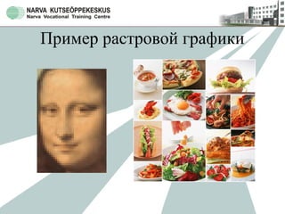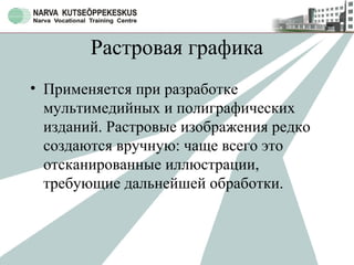 Документ описывает различные типы графики: растровую, векторную и фрактальную. Растровая графика часто создается с помощью сканирования и требует обработки, векторная графика используется для создания графических элементов, а фрактальная графика генерируется программным образом с помощью математических расчетов. Каждый тип графики имеет свои примеры и применяется в различных областях, включая мультимедийные и полиграфические издания.