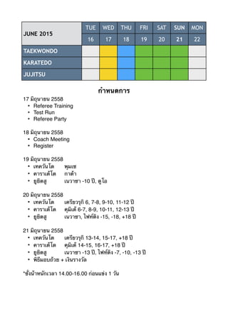 THU FRI SAT SUN MON 16 17 18 19 20 21 22 TAEKWONDO KARATEDO JUJITSU กำหนดการ 17 มิถุนายน 2558 • Referee Training • Test Run • Referee Party 18 มิถุนายน 2558 • Coach Meeting • Register 19 มิถุนายน 2558** • เทควันโด พุมเซ • คาราเต้โด กาต้า • ยูยิตสู เนวาซา -10 ปี, ดูโอ 20 มิถุนายน 2558 • เทควันโด เครียวรุกิ 6, 7-8, 9-10, 11-12 ปี • คาราเต้โด คุมิเต้ 6-7, 8-9, 10-11, 12-13 ปี • ยูยิตสู เนวาซา, ไฟท์ติง -15, -18, +18 ปี 21 มิถุนายน 2558 • เทควันโด เครียวรุกิ 13-14, 15-17, +18 ปี • คาราเต้โด คุมิเต้ 14-15, 16-17, +18 ปี • ยูยิตสู เนวาซา -13 ปี, ไฟท์ติง -7, -10, -13 ปี • พิธีมอบถ้วย + เงินรางวัล *ชั่งน้าหนักเวลา 14.00-16.00 ก่อนแข่ง 1 วัน **เฉพาะวันศุกร์ที่ 19 มิย. อนุญาตให้ชั่งชั่งน้าหนักถึงเวลา 22.00 น.