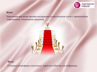 В документе описывается вторая ежегодная церемония вручения премии в области кардиологии, организованная в классическом стиле с современными техническими решениями. Цель мероприятия - создание статусной и уютной атмосферы для гостей, что достигается через оформление, музыкальное сопровождение и торжественную программу. На церемонии будут вручены награды в разных номинациях, а в завершение запланирован гала-концерт с участием известных артистов.