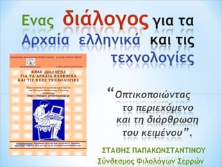 Η παρουσίαση του φιλολόγου και μέλους του Συνδέσμου Φιλολόγων Σερρών Στάθη Παπακωνσταντίνου στην Ημερίδα του Κέντρου Ελληνικής Γλώσσας με θέμα: "Ένας Διάλογος για τα Αρχαία Ελληνικά και τις Νέες Τεχνολογίες" που διοργάνωσε ο Σύνδεσμος Φιλολόγων Έβρου