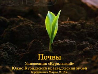 Документ рассматривает почву как важное природное тело, образующееся в результате взаимодействия органической и неорганической природы, подчеркивая ее плодородие. Описываются различные типы почв, характерные для Южно-Курильского заповедника, и звенья почвенной экосистемы от микрофауны до крупных животных. Также упоминаются антропогенные изменения и необходимость сохранения экосистемы почвы для поддержания её продуктивности.