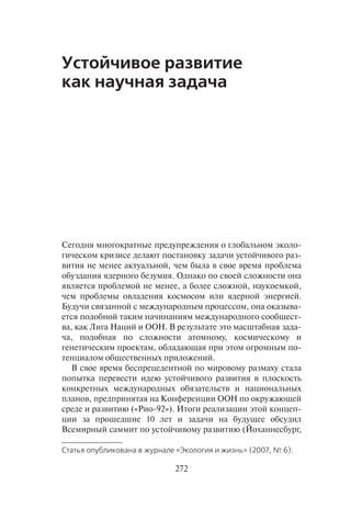 Документ обсуждает сложные проблемы устойчивого развития, сравнивая их с вызовами ядерной энергии и освоения космоса. Описываются разочарования в реализации идей устойчивого развития, выдвинутых на конференции «рио-92», и подчеркивается необходимость создания эффективных моделей для решения этих задач, которые занимают центральное место в современных науках. Также рассматриваются противоречия между быстро меняющимися и медленными процессами в контексте управления и экологии.