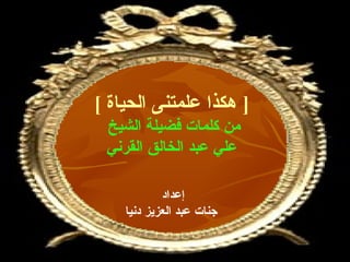 تناقش وثيقة "هكذا علمتني الحياة" لكلمات الشيخ علي عبد الخالق القرني مجموعة من الدروس الحياتية المستندة إلى العقيدة الإسلامية، حيث تؤكد على أهمية الإيمان بالقضاء والقدر، وأن الجزاء من جنس العمل. كما تشير إلى ضرورة الصبر وعدم اليأس، وأن النجاح في الدعوة يتطلب جهدًا مستمرًا وتفانيًا في الرسالة. تؤكد الوثيقة أيضًا على ضرورة النظر للجوانب الإيجابية في الحياة والحفاظ على الأخلاق والقيم.