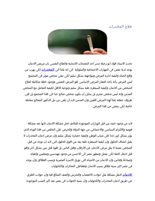 يتناول الوثيقة مشكلة تعاطي المخدرات وتأثيرها على المجتمع والصحة النفسية للمدمنين، مشيراً إلى أهمية التوعية والعلاج المتكامل لمواجهة هذه الظاهرة. كما يبرز ضرورة تكاتف جهود الوزارات والمؤسسات المختلفة لمكافحة هذه الأزمة التي تؤثر بشكل كبير على الشباب والمجتمع. الوثيقة تؤكد على أهمية الوعي والمعالجة النفسية والاجتماعية للمدمنين كخطوات حيوية نحو الشفاء والتعافي.