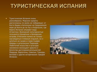 Испания предлагает разнообразные туристические направления, включая морские курорты на Коста-Брава и Коста-дель-Соль, а также Канарские и Балеарские острова. Разные регионы подходят для отдыха с детьми, активного времяпрепровождения или люксового отдыха, предлагая множество отелей и развлечений. Основные курорты включают популярные места, такие как Тенерифе, Ибица и Майорка, с возможностями разного бюджета и уровней сервиса.