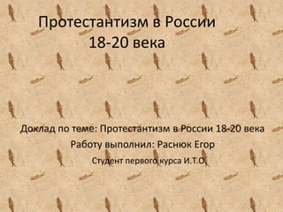 Доклад описывает историю и распространение протестантизма в России в 18-20 веках, начиная с его возникновения в Европе и далеким от католицизма развитием. В России протестантизм получил формы лютеранства и евангельских христиан-баптистов, особенно после международной реформации и со временем подвергался различным уровням преследований, включая гонения в советский период. По состоянию на 2003 год в России зарегистрировано около 5 тысяч протестантских церквей, с количеством членов более 1 миллиона.