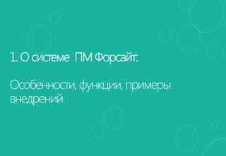 Документ описывает систему ПМ Форсайт, которая представляет собой комплексное решение для управления проектами, включая автоматизацию отчетности и планирования. Система поддерживает гибкое управление проектами, контроль по контрольным точкам и интеграцию с MS Project Server. Приведены примеры внедрения системы в различные проекты, включая спортивные события и государственные учреждения.