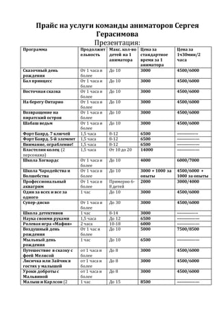 Документ представляет прайс-лист услуг команды аниматоров Сергея Герасимова с ценами на различные программы для детей. Услуги включают разнообразные тематические дни рождения и мероприятия, такие как 'Сказочный день рождения', 'Властелин колец' и 'Научные эксперименты', с указанием времени, максимального количества участников и цен. Цены варьируются от 2000 до 14000 рублей в зависимости от выбранной программы и продолжительности.
