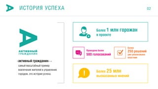 Проект «Активный гражданин» за первый год работы провел более 580 голосований и реализовал более 250 решений, вовлек более 1 миллиона участников и собрал свыше 25 миллионов мнений. В рамках проекта было озеленено почти 1000 дворов, организованы новые автобусные маршруты и внедрены инновации в госуслугах. Кроме того, проект стал признанным в своей области, получив несколько наград, включая лучшее мобильное приложение для госсектора.