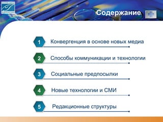 Документ посвящен анализу конвергенции в медиа, рассматривая новые технологии и изменения в коммуникации. Он описывает процесс дигитализации, влияние социальных изменений на медиаиндустрию и переход к индивидуализированным форматам. В заключение, акцентируется внимание на вызовах, с которыми сталкиваются традиционные СМИ в условиях растущей конкуренции и изменяющихся потребностей аудитории.