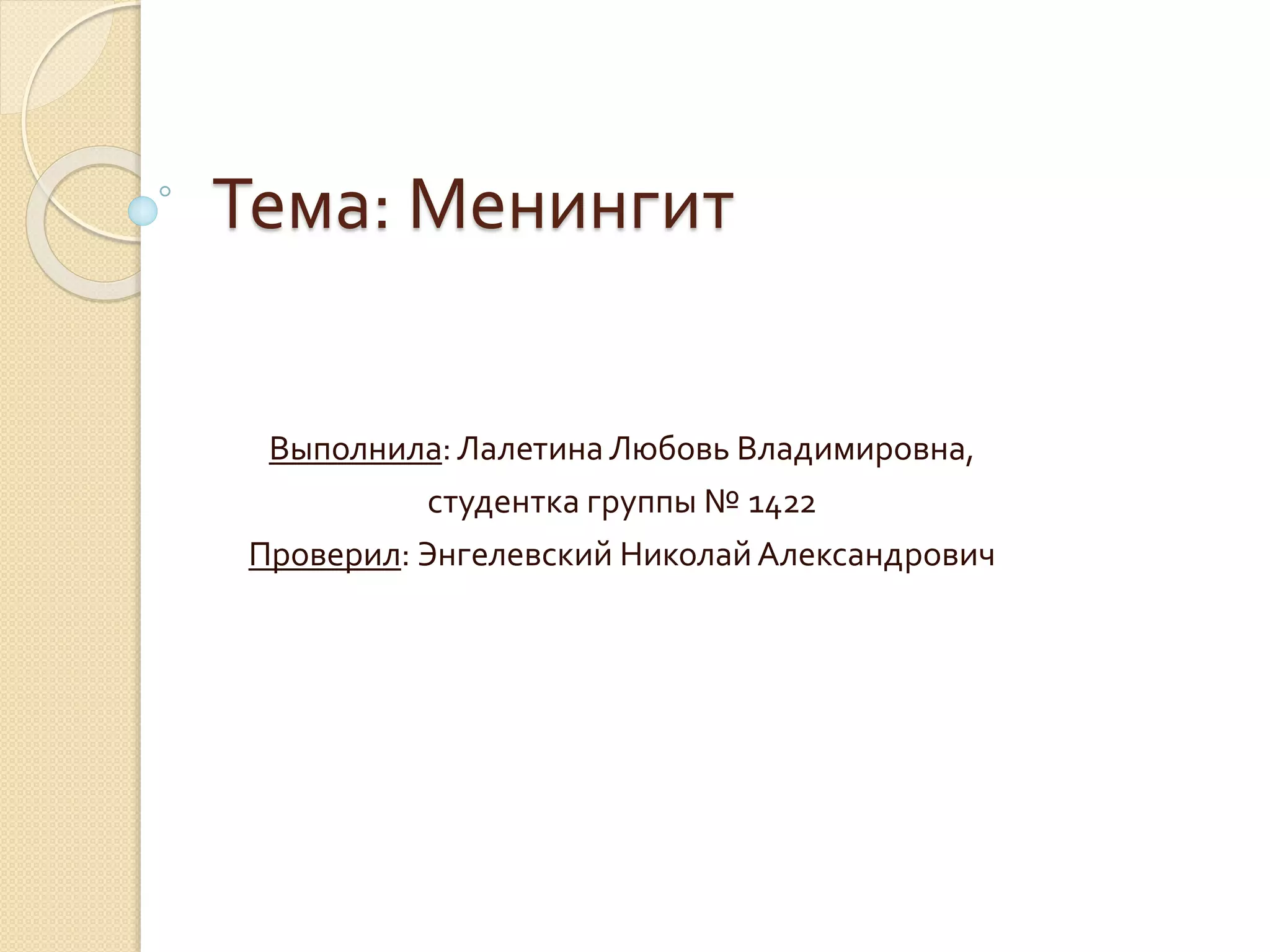 Документ рассматривает менингит как инфекционное заболевание, вызванное вирусами и бактериями, с акцентом на этиологию, клинические проявления и степень тяжести. Основные причины менингита различаются у детей и взрослых, с преобладанием энтеровирусов у детей и бактериального менингита у взрослых. Клинические признаки варьируются от легкой формы с умеренной температурой до тяжелой формы с высокой гипертензией и менингеальными признаками.